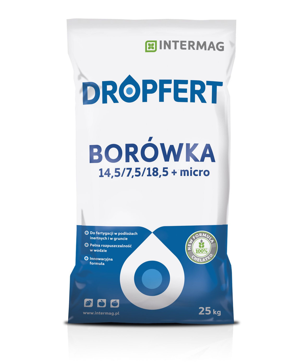 Dropfert Borówka 14,5/7,5/18,5 + micro to krystaliczny nawóz NPK (14,5/7,5/18,5) rozpuszczalny w wodzie. Jest to nawóz wzbogacony w magnez, siarkę oraz mikroelementy. Przeznaczony jest do fertygacji upraw w podłożach inertnych, organicznych oraz w gruncie.