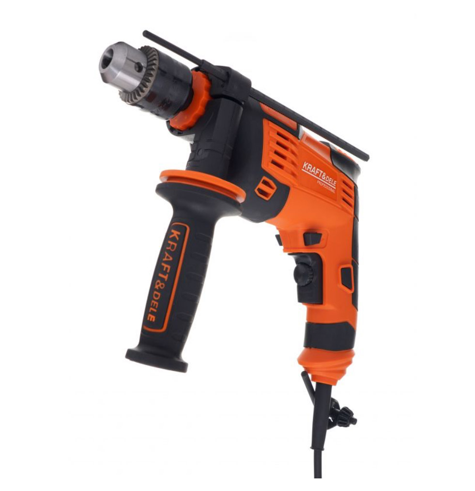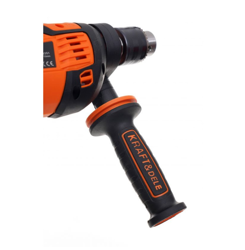 Elektryczna wiertarka udarowa Kraft&Dele KD3351 o mocy 1600W przeznaczona do wiercenia udarowego w murze, betonie i kamieniu oraz do wiercenia w metalu, ceramice, drewnie i tworzywie sztucznym. Główna rękojeść została wykonana ze specjalnego antypoślizgowego materiału ułatwiającego trzymanie urządzenia w dłoni. Jest to wersja wyposażona w dodatkową rękojeść boczną. Głowica wykonana z metalu.