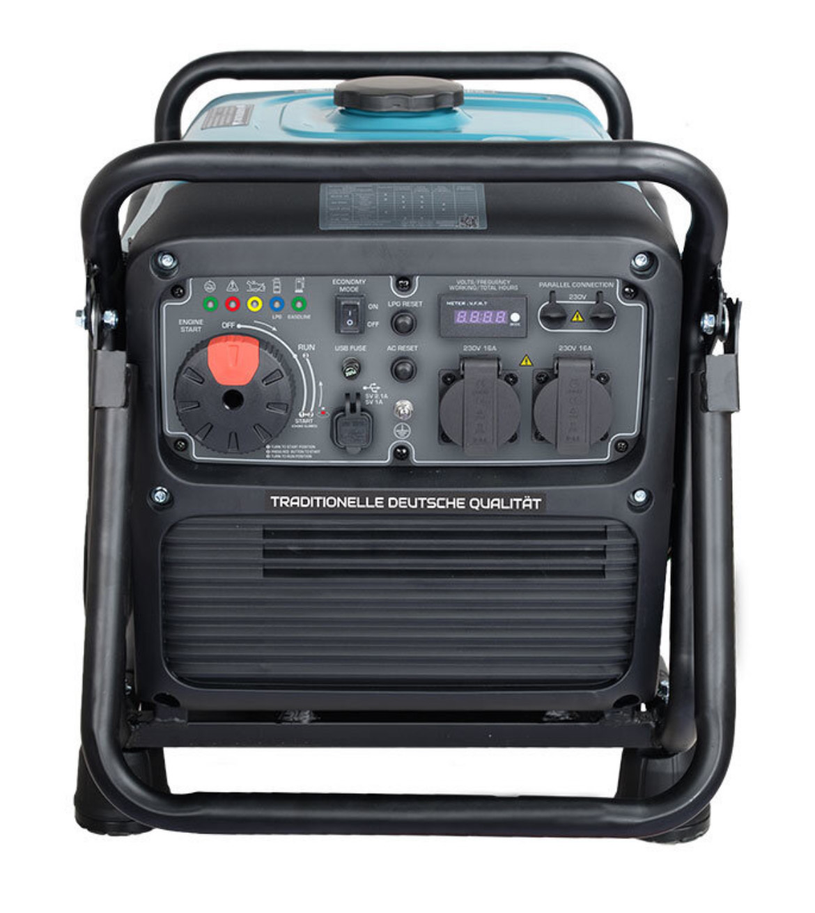 Wygodne zlokalizowanie wszystkich funkcji: wielofunkcyjny wyświetlacz LED (licznik godzin pracy, napięcie, częstotliwość), wskaźniki monitorowania pracy generatora prądotwórczego pokazują: aktualny stan pracy, informacje w przypadku przeciążenia lub zwarcia oraz o niskim poziomie oleju, przycisk Reset do ponownego uruchomienia systemu kontroli i wznowienia zasilania, złącze do równoległego podłączenia generatorów, dwa wyjścia USB (5V/1A, 5V/2.1A) pozwala na podłączenie gadżetów, gniazda 230V oraz zacisk uziemienia.