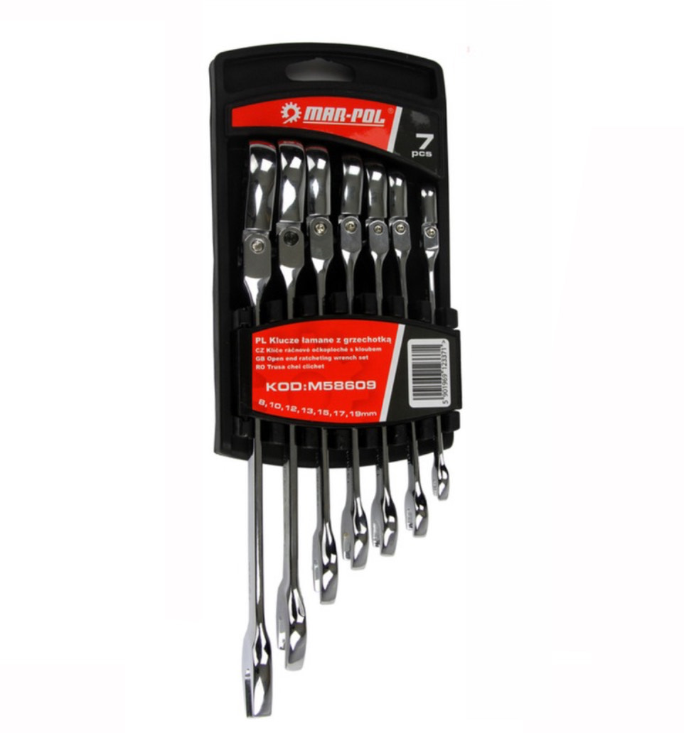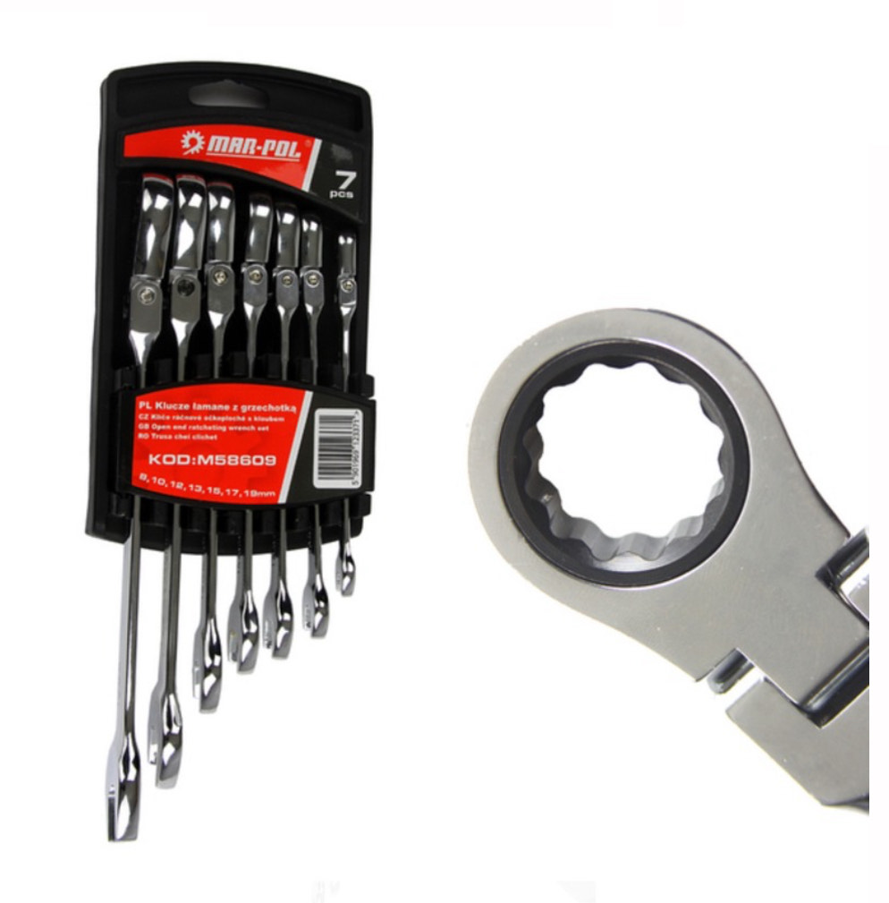Zestaw kluczy płasko oczkowych łamanych z grzechotką, składający się z 7 elementów.