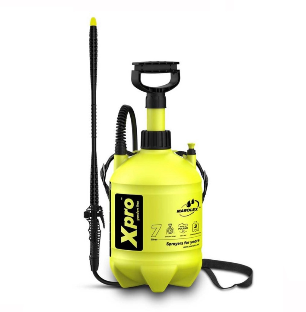 Xpro 7 litrowy ręczny opryskiwacz ciśnieniowy posiada zbiornik z 3 letnią gwarancją, wykonany z polietylenu dzięki temu jest on lekki, wytrzymały co gwarantuje bezawaryjną wieloletnią pracę. Wyposażony jest w wydajną pompę co znacznie skraca czas uzyskania ciśnienia roboczego. Posiada odporną na uszkodzenia lancę o długości 44 cm zakończoną dyszą MR1.5-90° z regulacją kąta strumienia, to pozwala w dowolny sposób dostosować kąt oprysku do rodzaju przeprowadzanych zabiegów. Zawiera zawór dozujący z blokadą przycisku dlatego podczas prowadzenia oprysków nie ma konieczności ciągłego trzymania przycisku, dzięki temu nawet długa praca nie jest męcząca. Posiada wąż z potrójnym oplotem 130 cm wzmocniony sprężyną, która chroni go przed załamaniem oraz regulowany pas naramienny. Ciśnienie robocze 0,25 MPa jest optymalne niezależnie od rodzaju przeprowadzanych oprysków. Umieszczony na zbiorniku pasek poziomu cieczy z czytelną podziałką ułatwia określenie ilości cieczy. Wszystkie podzespoły użyte w opryskiwaczu są oryginalne i występują w innych seriach opryskiwaczy co sprawia, że wyróżnia je wysoka jakość i bezawaryjność. Możliwość dokupienia dowolnych akcesoriów takich jak przedłużacz czy lanca 3m, osłona herbicydowa czy dysze pozwalają na dostosowanie opryskiwacza odpowiednio do tego jak będzie się zmieniał rodzaj i zakres przeprowadzanych oprysków.
