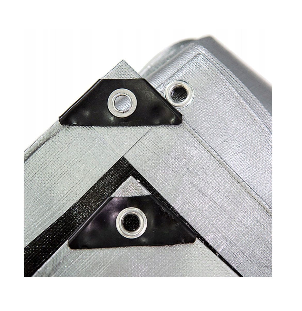 Plandeka wykonana z polipropylenu, pokrytego z obu stron warstwą polietylenu. Wzmocnione obszycia linowe. Aluminiowe oczka w odstępach 1 m.