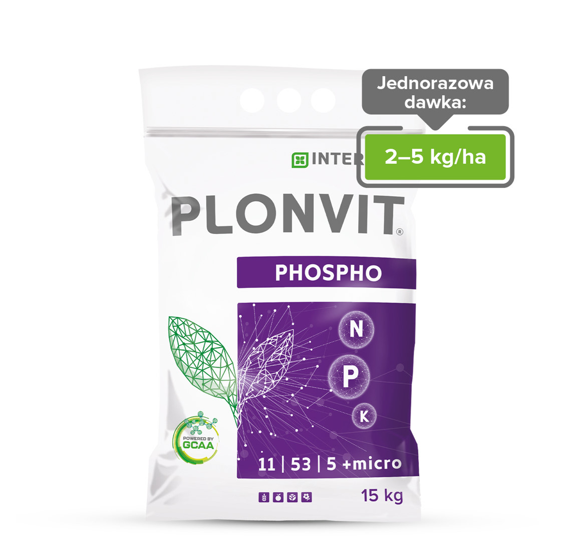 Plonvit Phospho 11/12/38 + micro to krystaliczny nawóz NPK (11/53/5) ze zwiększoną zawartością fosforu, przeznaczony do stosowania dolistnego. Wzbogacony jest w mikroelementy z technologią GCAA. Plonvit Phospho 11/12/38 + micro skutecznie odżywia rośliny, wspomaga prawidłowy rozwój systemu korzeniowego oraz jego regenerację, wpływa korzystnie na kwitnienie i rozwój organów wegetatywnych i generatywnych.