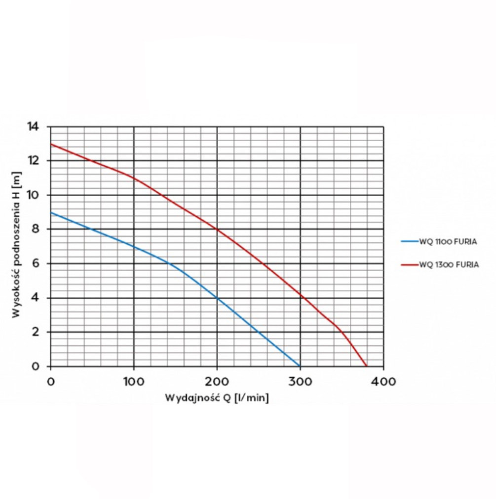 Pompa zatapialna WQ 1300 FURIA rozdrabniaczem to pompa dedykowana do ścieków, gnojowicy, wody z obecnością zanieczyszczeń organicznych i zanieczyszczeń bytowych. Pompa posiada system rozdrabniający który wstępnie tnie na kawałki pompowane medium dzięki czemu w rurociągu nie występuje efekt zapychania się odcinka tłocznego. Pompa posiada sterowanie pływakowe które steruje załączaniem się w zależności od poziomu pompowanego medium i chroni pompę przed pracą na sucho. WQ 1300 FURIA wyposażona jest w zabezpieczenie nadprądowe, na kablu zasilającym, chroniące silnik urządzenia przed przeciążeniem w przypadku zablokowania się wirnika np. patykiem. WQ 1300 FURIA z powodzeniem może być stosowana jako pompa do opróżniania zbiorników ściekowych, w gospodarstwach wiejskich i domowych.