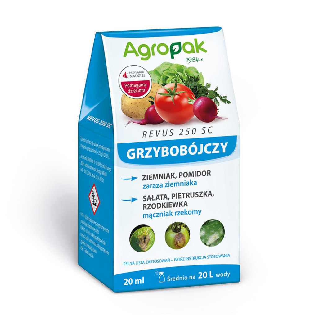Revus 250 SC niezawodny, wysoce selektywny środek grzybobójczy, o działaniu wgłębnym i kontaktowym, do stosowania głównie zapobiegawczego i interwencyjnego w ochronie ziemniaka przed zarazą ziemniaka oraz pomidorów gruntowych i innych upraw warzywnych przed chorobami grzybowymi. Produkt ma postać stężonej zawiesiny do rozcieńczania wodą przed zastosowaniem. Zawiera 250g/L mandipropamidu, substancji aktywnej, która niezwykle szybko wiązana jest w warstwie woskowej na powierzchni liści i łodygi, skąd przemieszcza się translamiralnie wewnątrz rośliny chroniąc przyrosty liściowe. Dzięki tej właściwości środek jest niezwykle odporny na zmywanie przez deszcz.