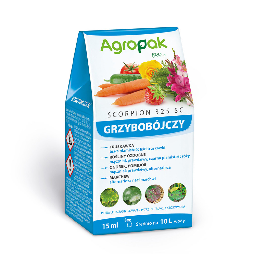 Scorpion 325 SC to środek grzybobójczy, o działaniu powierzchniowym i systemicznym. Przeznaczony do stosowania zapobiegawczego i interwencyjnie w walce z chorobami wywoływanymi przez grzyby w uprawach warzywnych, truskawce oraz roślinach ozdobnych.